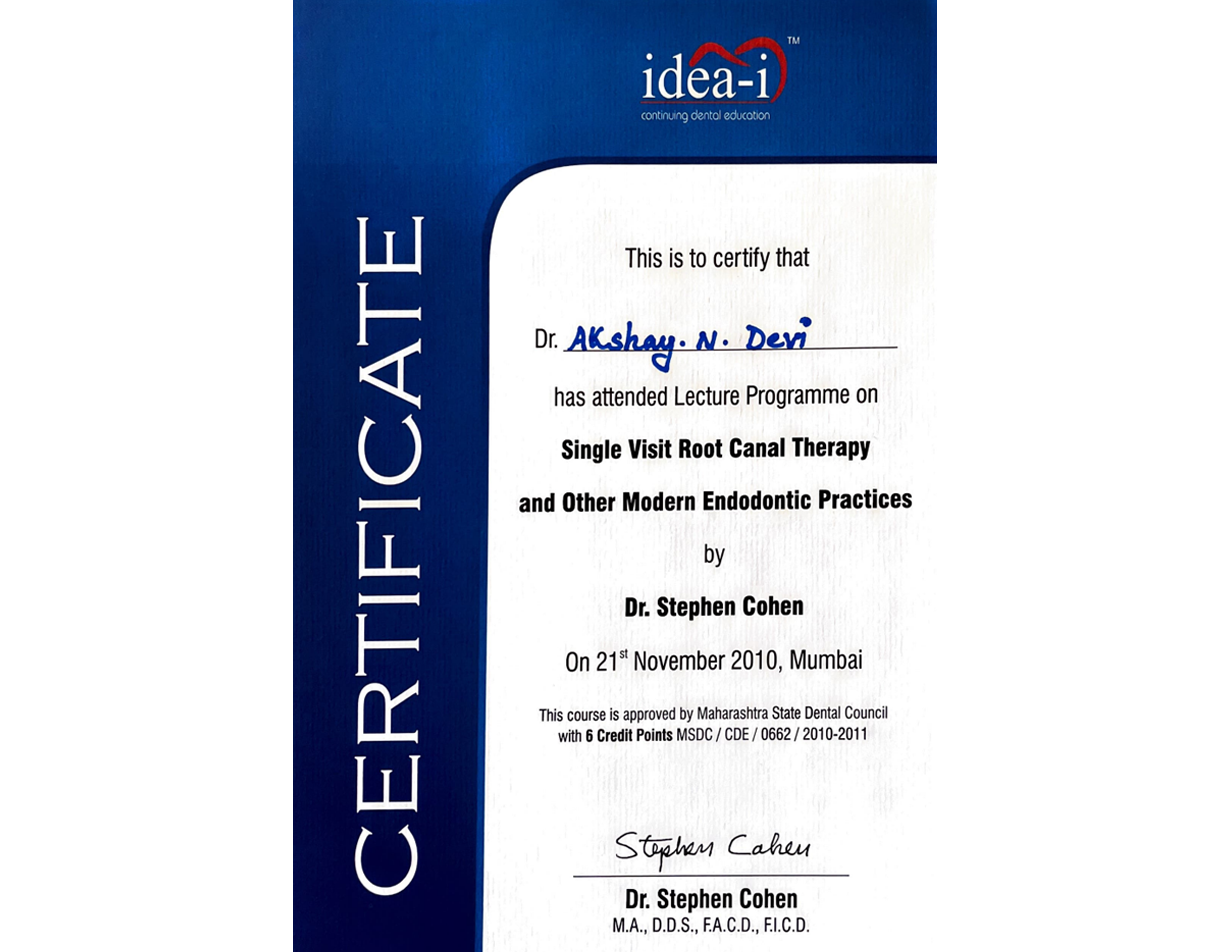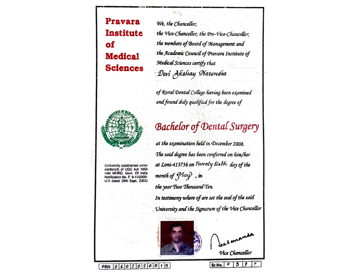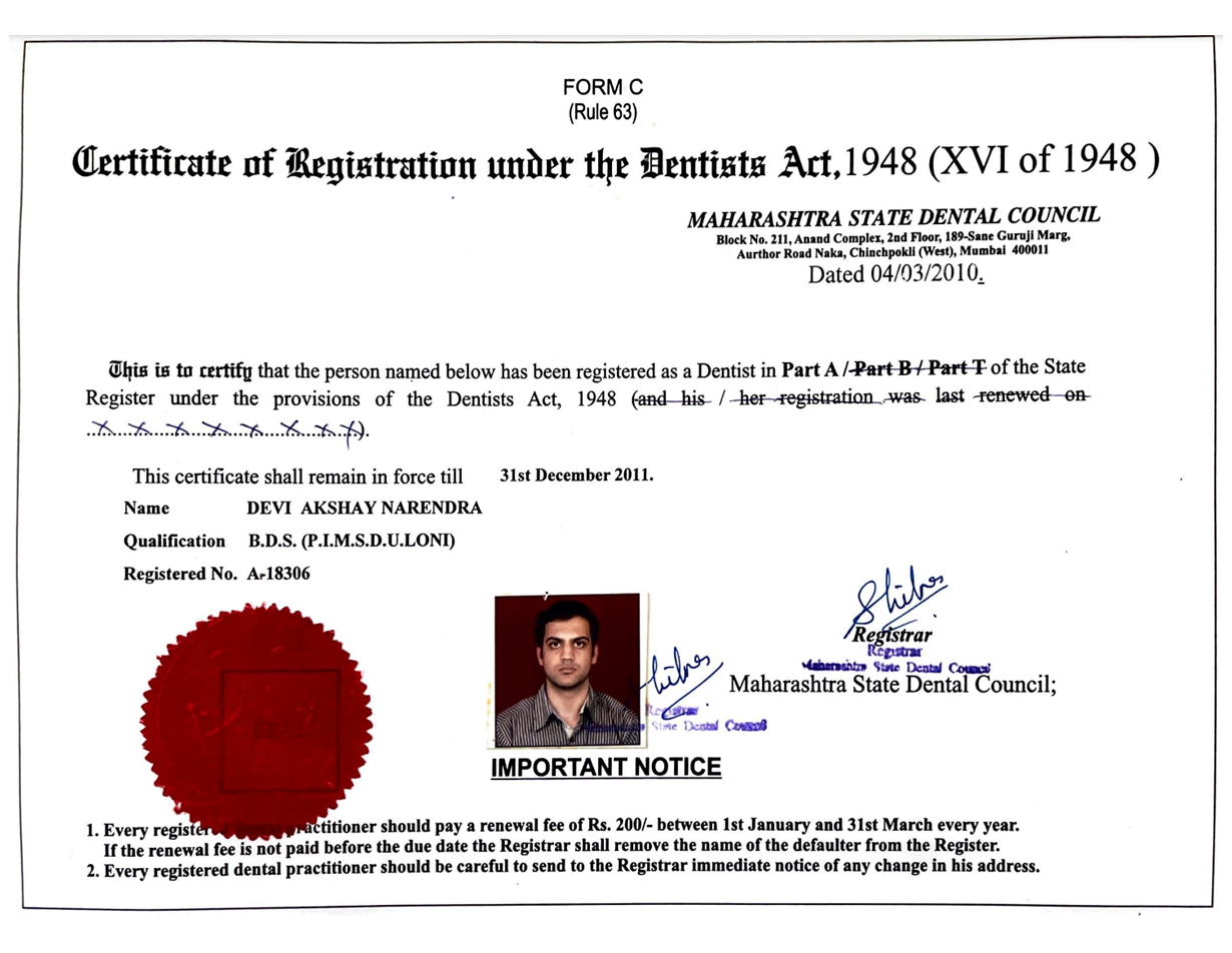 Dr. Akshay Devi holds nationally recognized certifications, reflecting a commitment to the highest standards in dental care.